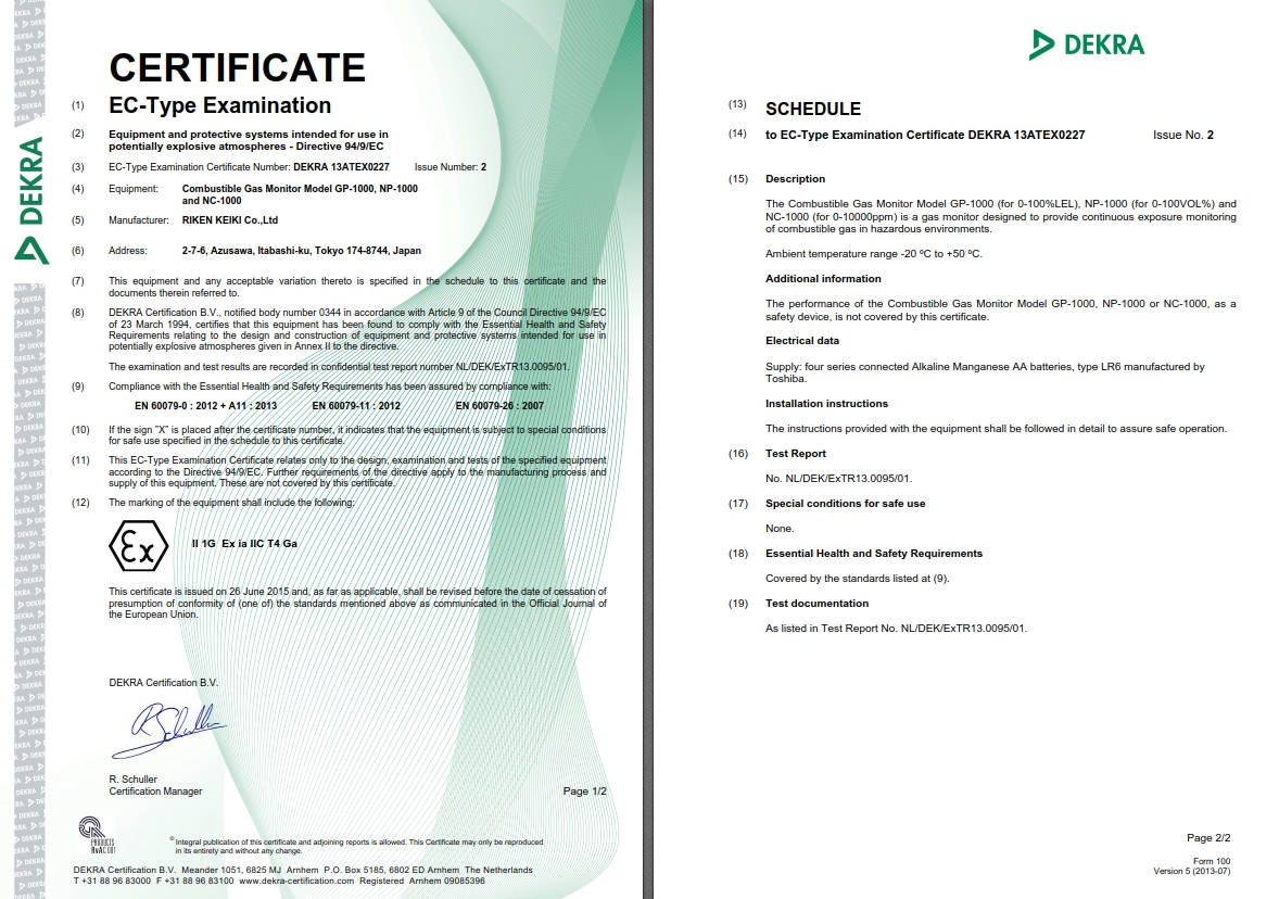 ATEX証 GP-1000,NP-1000,NC-1000 DEKRA13ATEX0227 Issue No.2