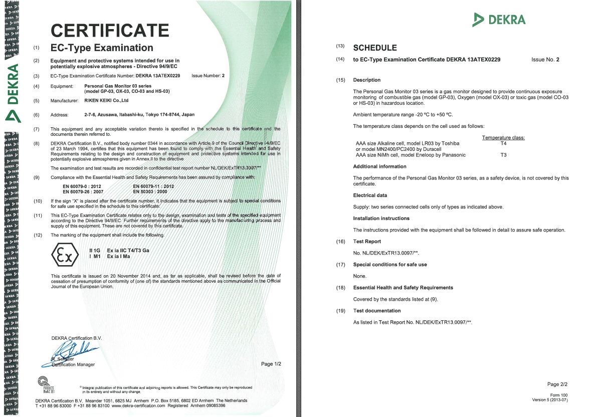 ATEX証 CO-03,GP-03,HS-03,OX-03 DEKRA 12ATEX0229 Issue No.2